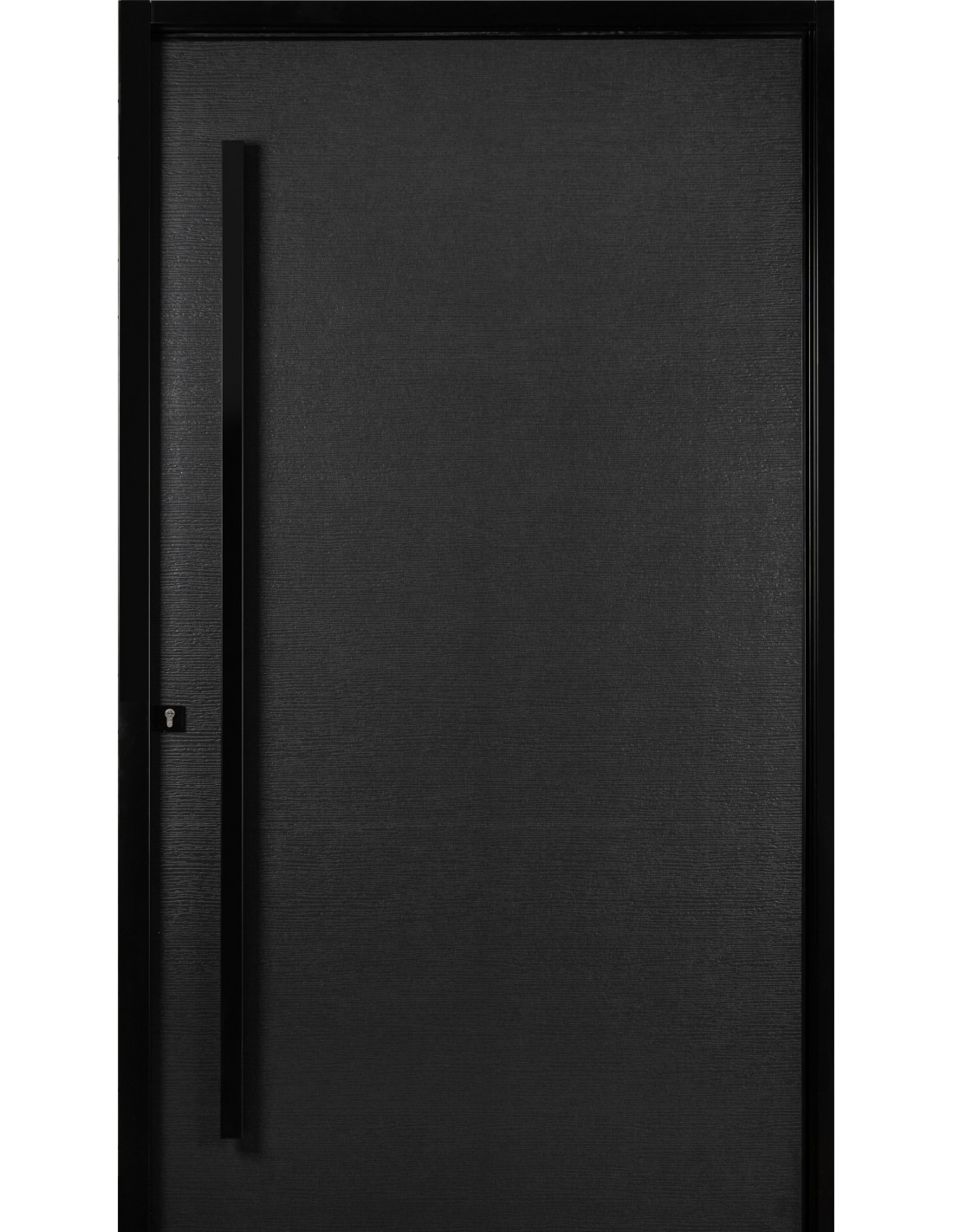 Es una puerta pivotante de acero, lista para instalar, con un sistema propio de ajuste de la altura de la hoja. Libre de mantenimiento. Hoja lisa con novedosa textura al tacto, tapacanto de aluminio negro.